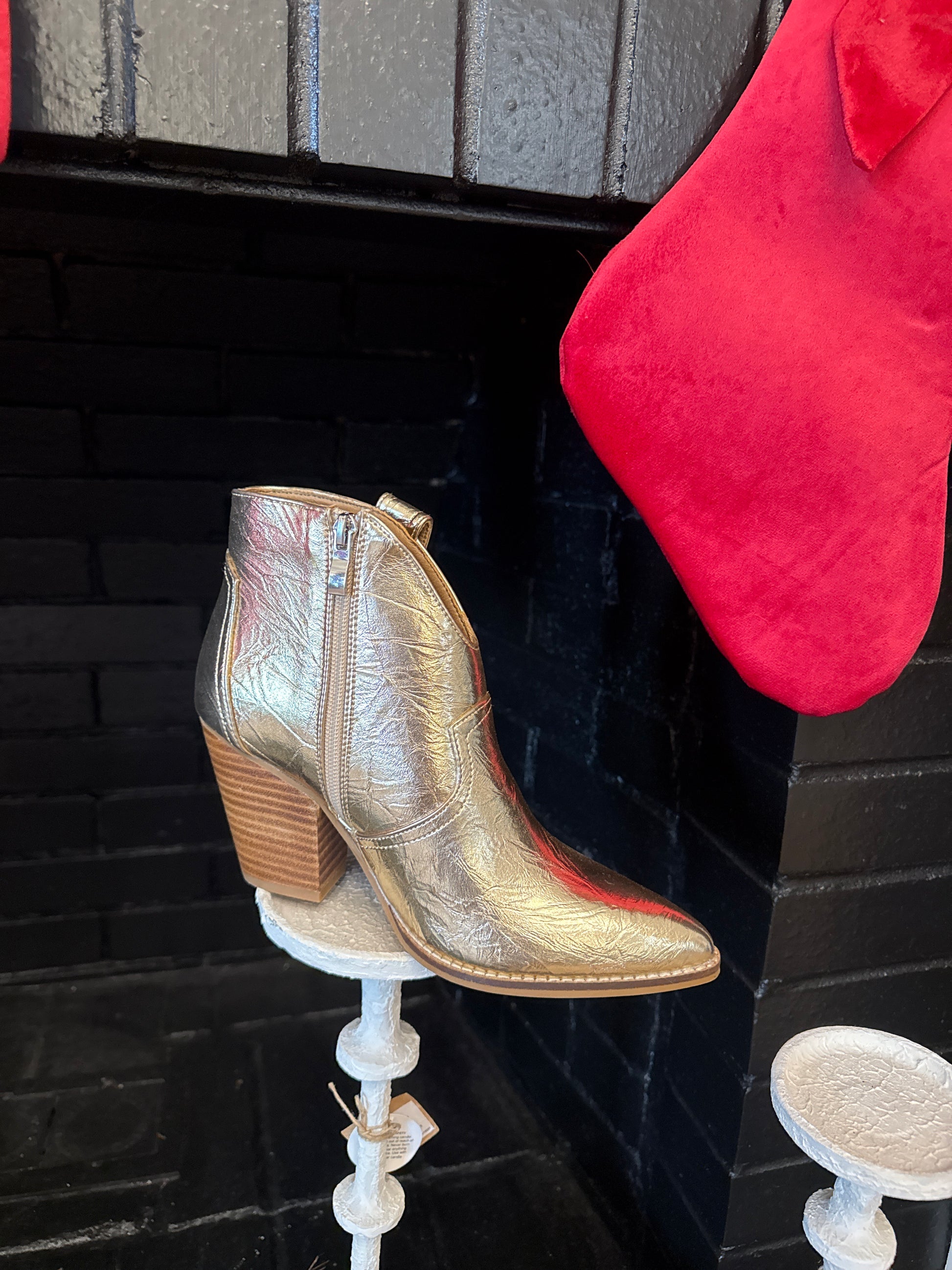 Step into effortless style with this gold wrinkle Western bootie that screams understated edge. The pointed toe and angled silhouette pair beautifully with a stacked wooden heel for that perfect balance of sass and sophistication. Whether you're pairing it with a romantic dress or your favorite ripped jeans, this bootie delivers the kind of versatile charm that works from brunch to night out. Pure cool-girl energy in every step.