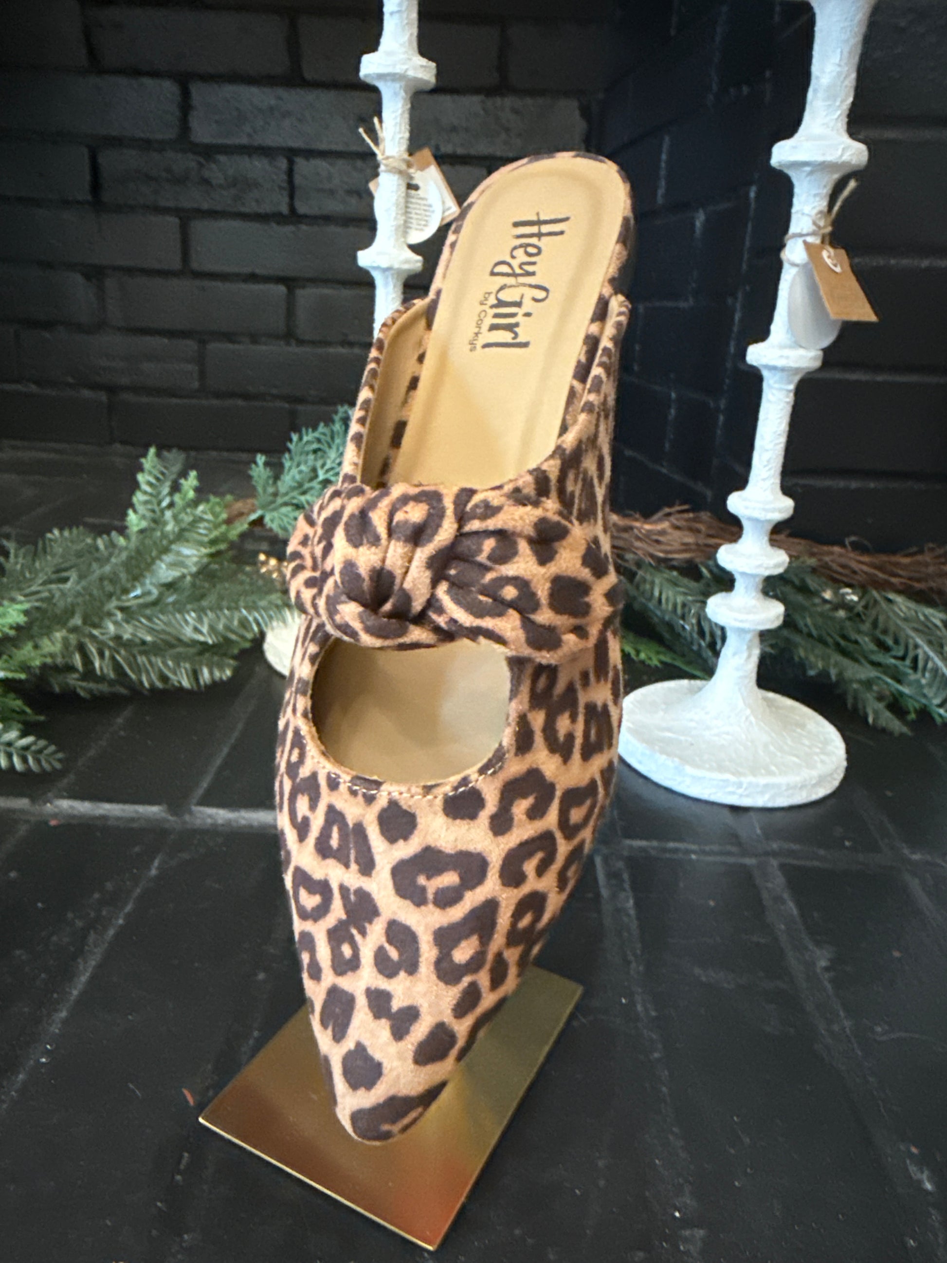 Step into the spotlight with these leopard print mules that inject personality into your daily rotation. The sharp pointed silhouette and charming knot embellishment deliver a playful twist on classic slip-on comfort. Whether you're rocking denim, a flowing skirt, or your favorite dress, these statement shoes are your ticket to looking effortlessly fabulous.