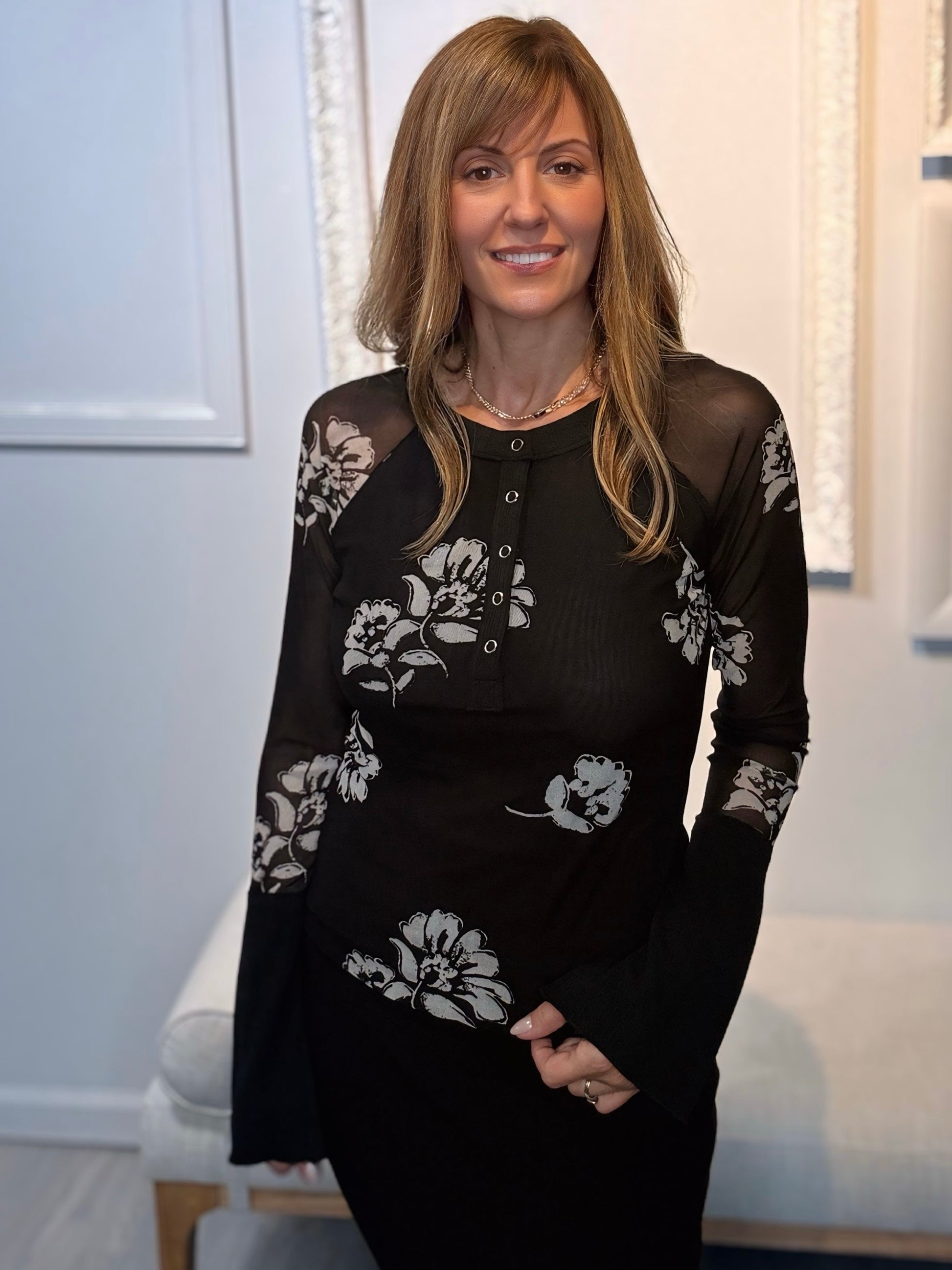 A floral-print mesh top with the following features: Round neckline with rib-knit trim. Half-snap henley closure. Long raglan sleeves. Split cuffs in contrasting rib-knit. Lettuce-edge hem. Sleeveless lining. Fitted silhouette.