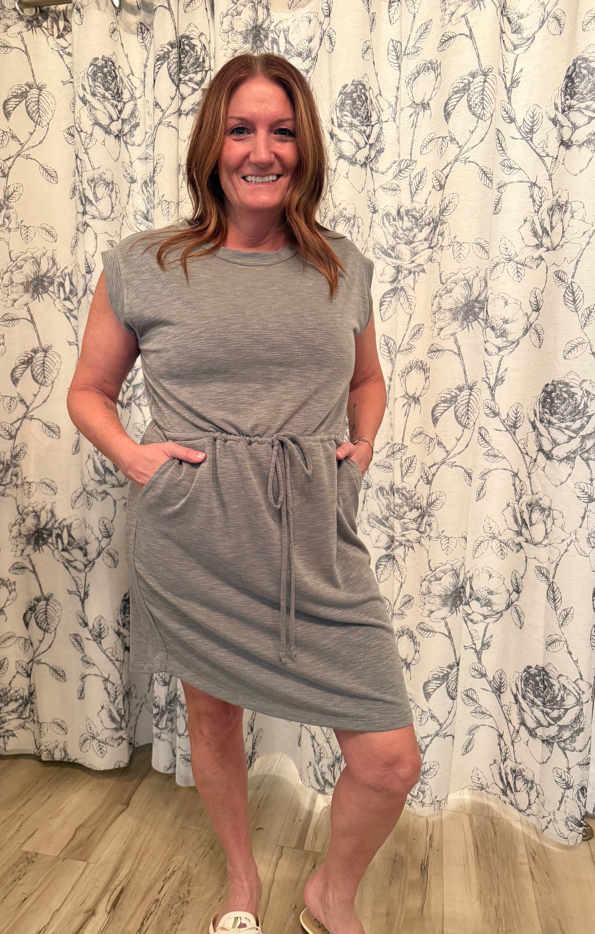 Drawstring waist, short sleeve, slub french terry dress with side pockets