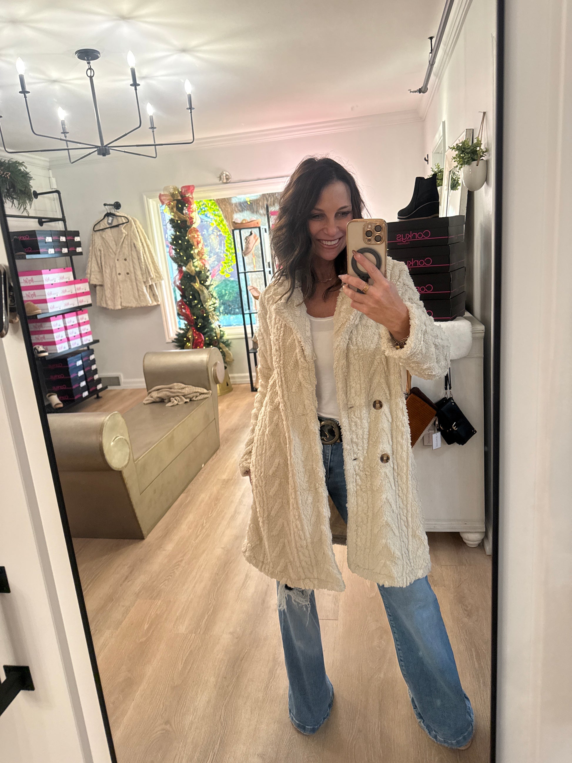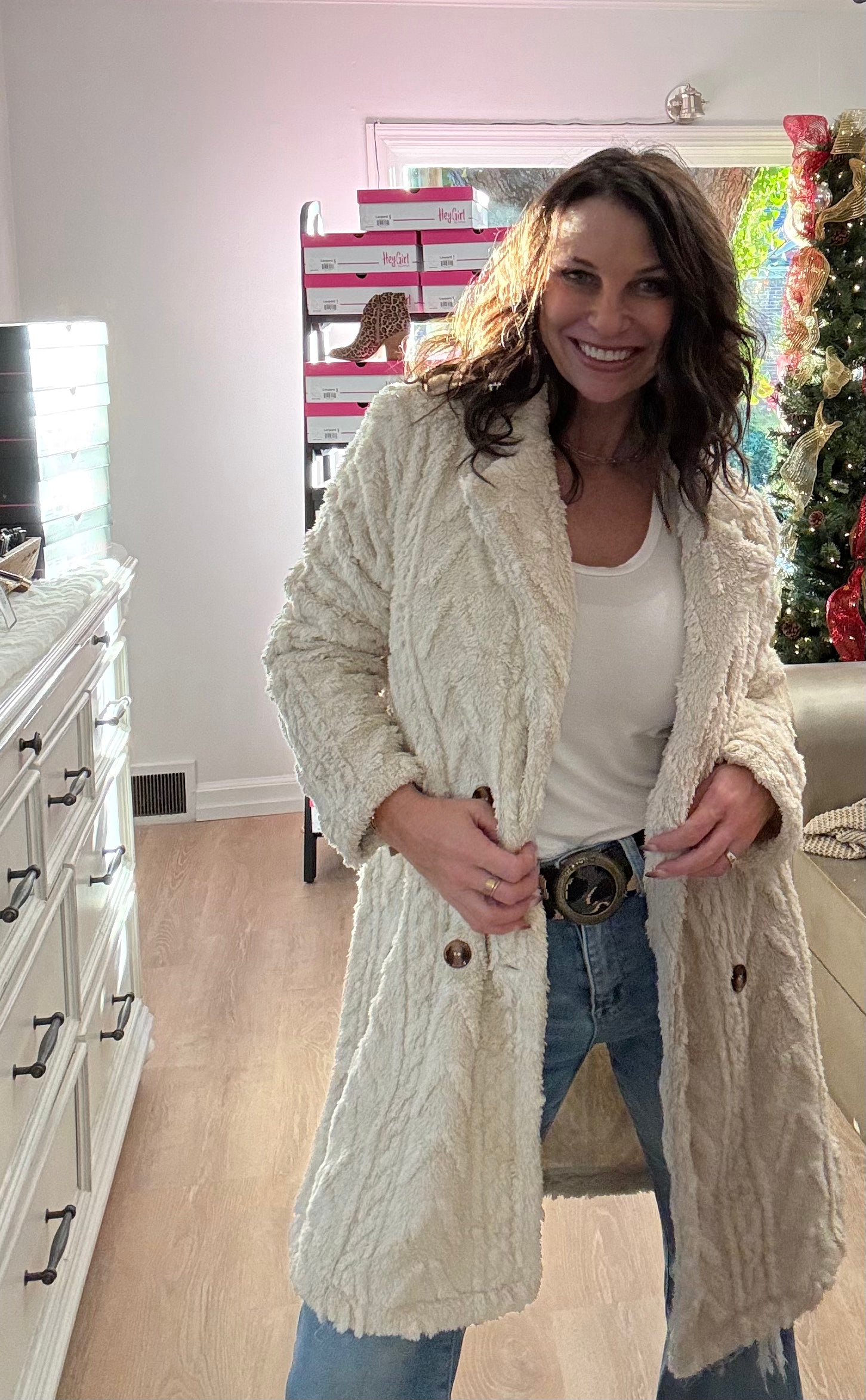 This ultra-cozy fleece coat features a stylish houndstooth pattern, combining comfort and fashion. With a button-up closure and a notched collar, it adds a chic yet relaxed look to any outfit. Perfect for staying warm and looking stylish this season.