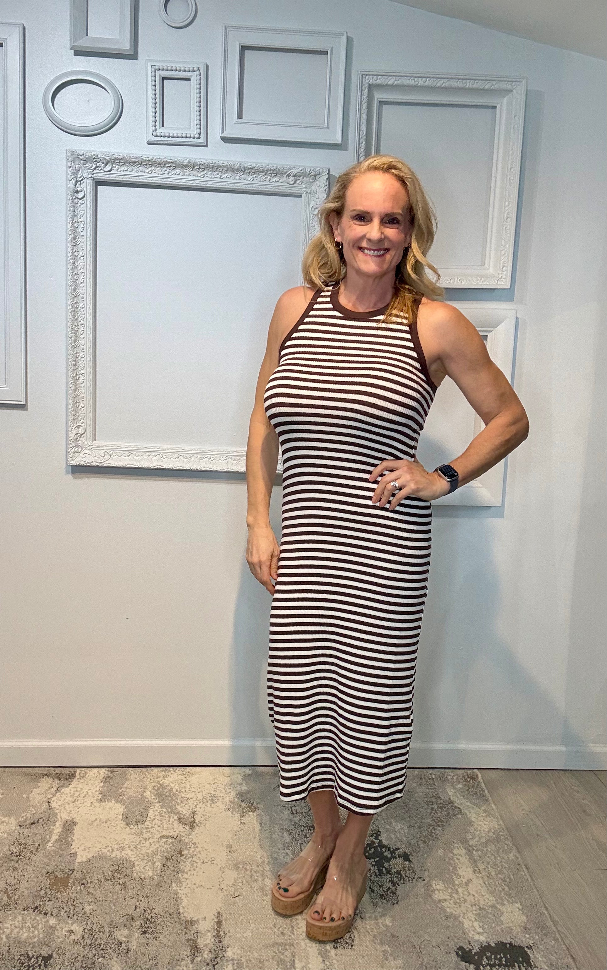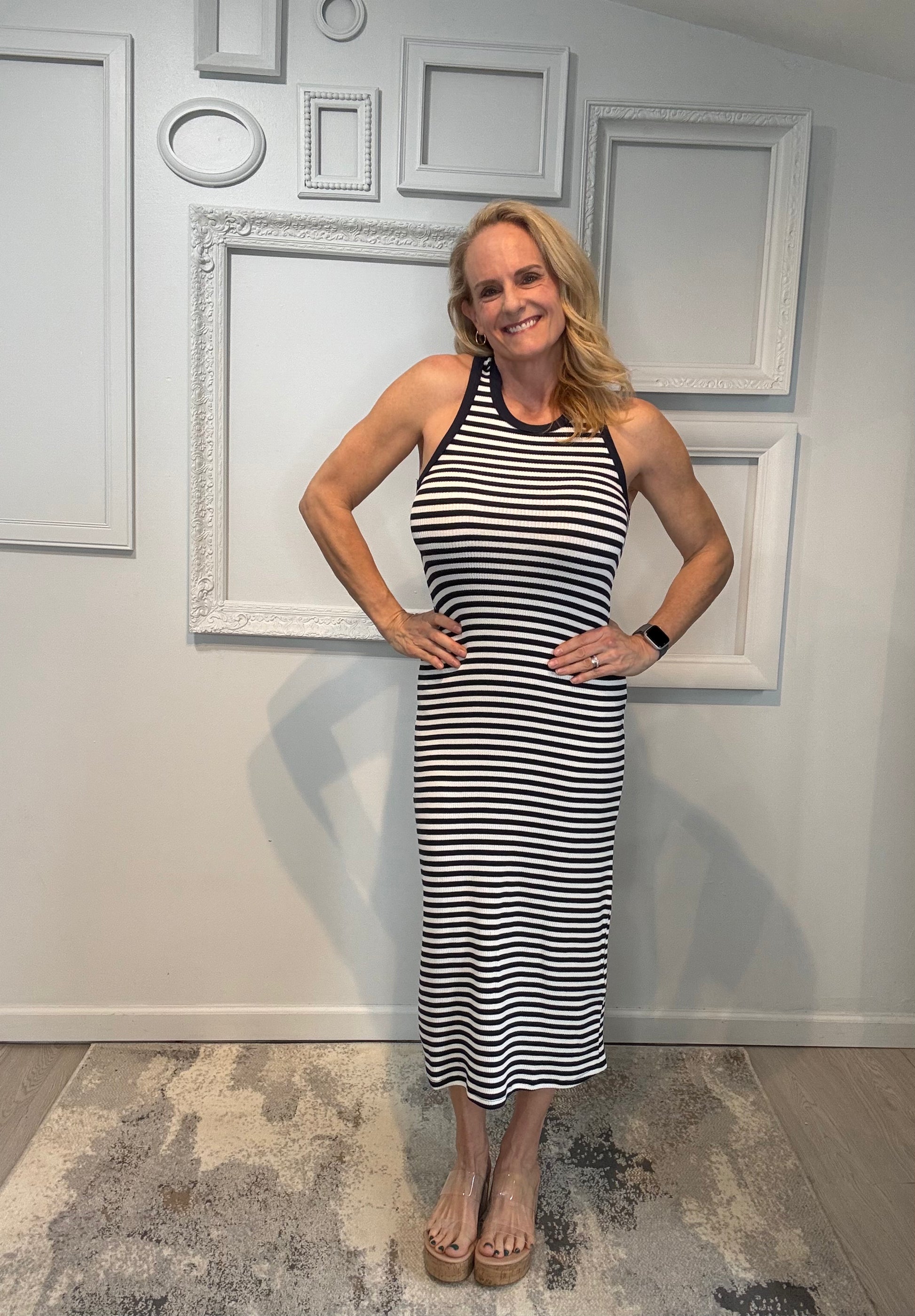 Knit Cotton Spandex Striped Ribbed Round Neck Sleeveless Midi Dress (No Lining)