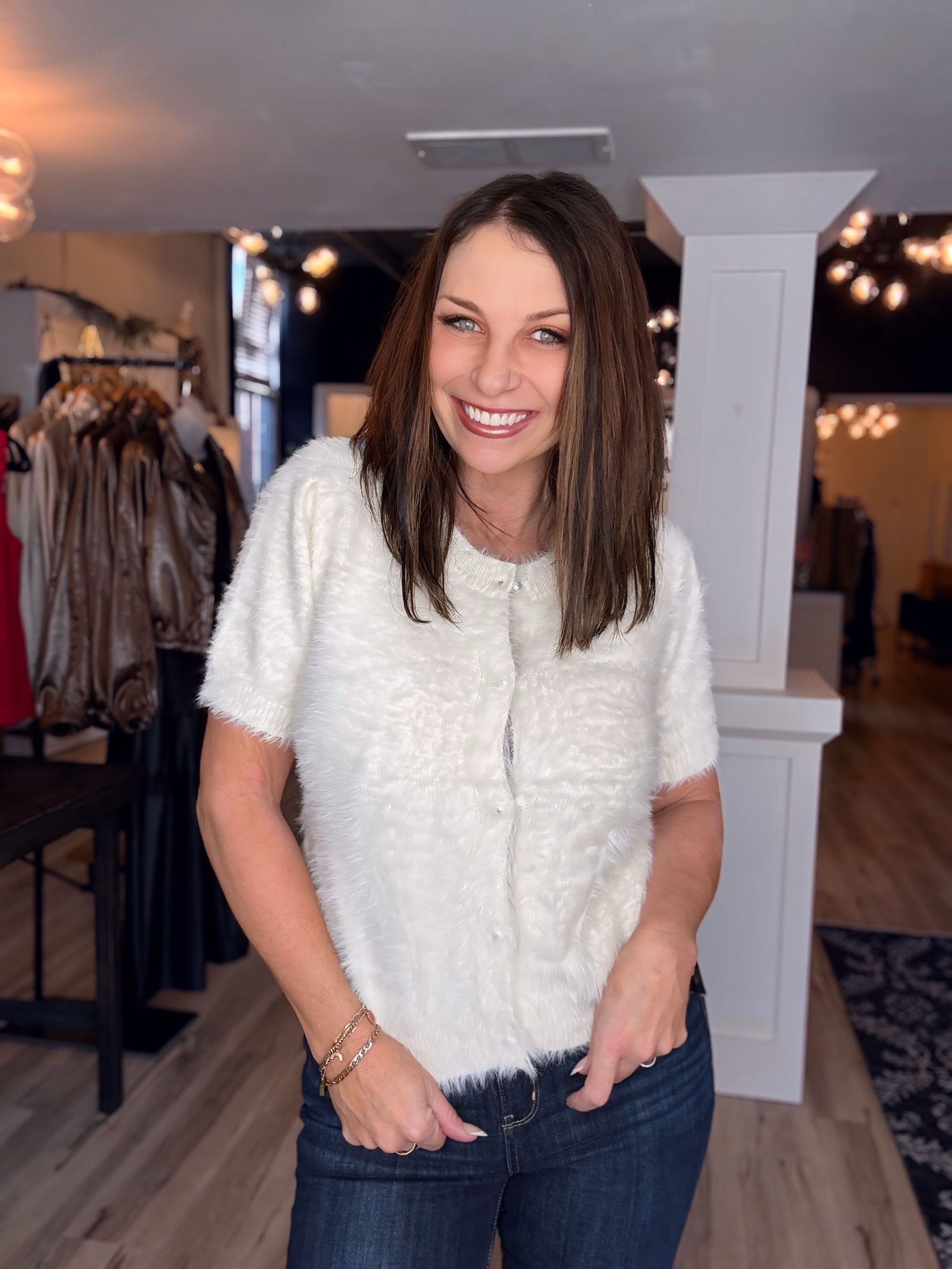+ Fuzzy mohair knit short sleeve sweater cardigan + Round neckline + Button down placket + Pearl buttons + Short puff sleeves + Relaxed, waist length fit