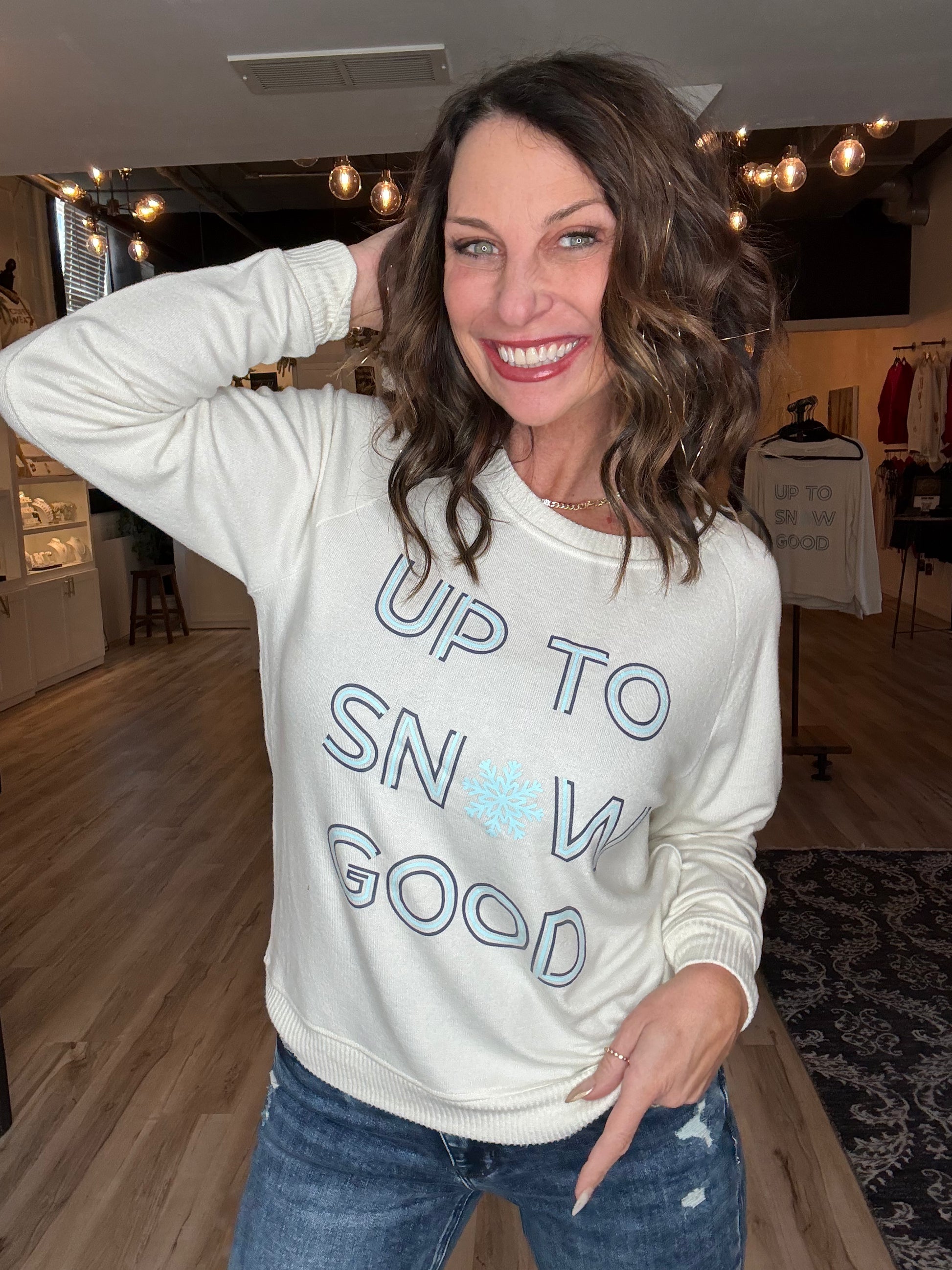 For the snow chasers, hot cocoa sippers, and twinkle light lovers, this playful long sleeve is pure winter joy. Made from soft hacci knit with a relaxed shape and subtle whimsy, it’s made for days spent off the grid and off the clock. * Relaxed fit * Crew neck * "UP TO SNOW GOOD" text * Soft hacci knit