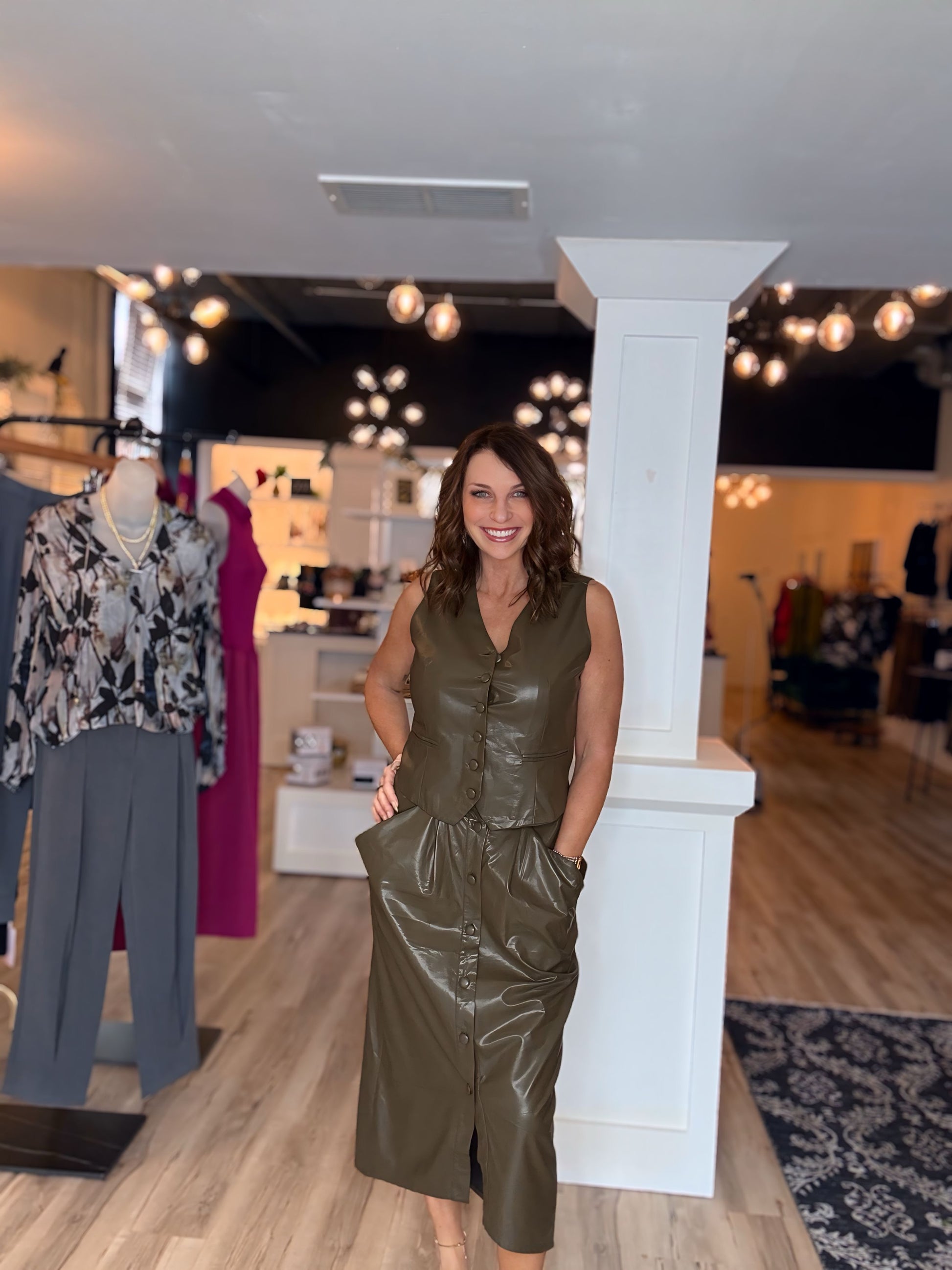 Vegan Leather Button Down Pencil Skirt The Vegan Leather Button Down Pencil Skirt combines contemporary fashion with ethical choices, made from high-quality vegan leather. This sleek pencil skirt features a stylish button-down front, adding a touch of sophistication to any outfit. Its form-fitting design accentuates your silhouette while providing comfort and versatility for various occasions. Fabric: Woven 60% POLYURETHANE 40% POLYESTER Hand Wash Cold