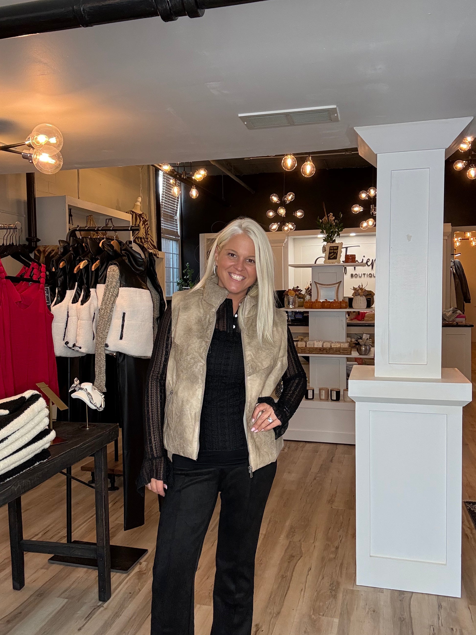 Vegan Leather Puffer Vest With Front Zipper The Sleeveless Vegan Leather Puffer Vest with Front Zipper combines edgy style with functional design. This vest features a sleek, sleeveless silhouette and is crafted from high-quality vegan leather. The front zipper adds practicality, making it perfect for layering. Fabric: Woven 45% POLYURETHANE 55% VISCOSE