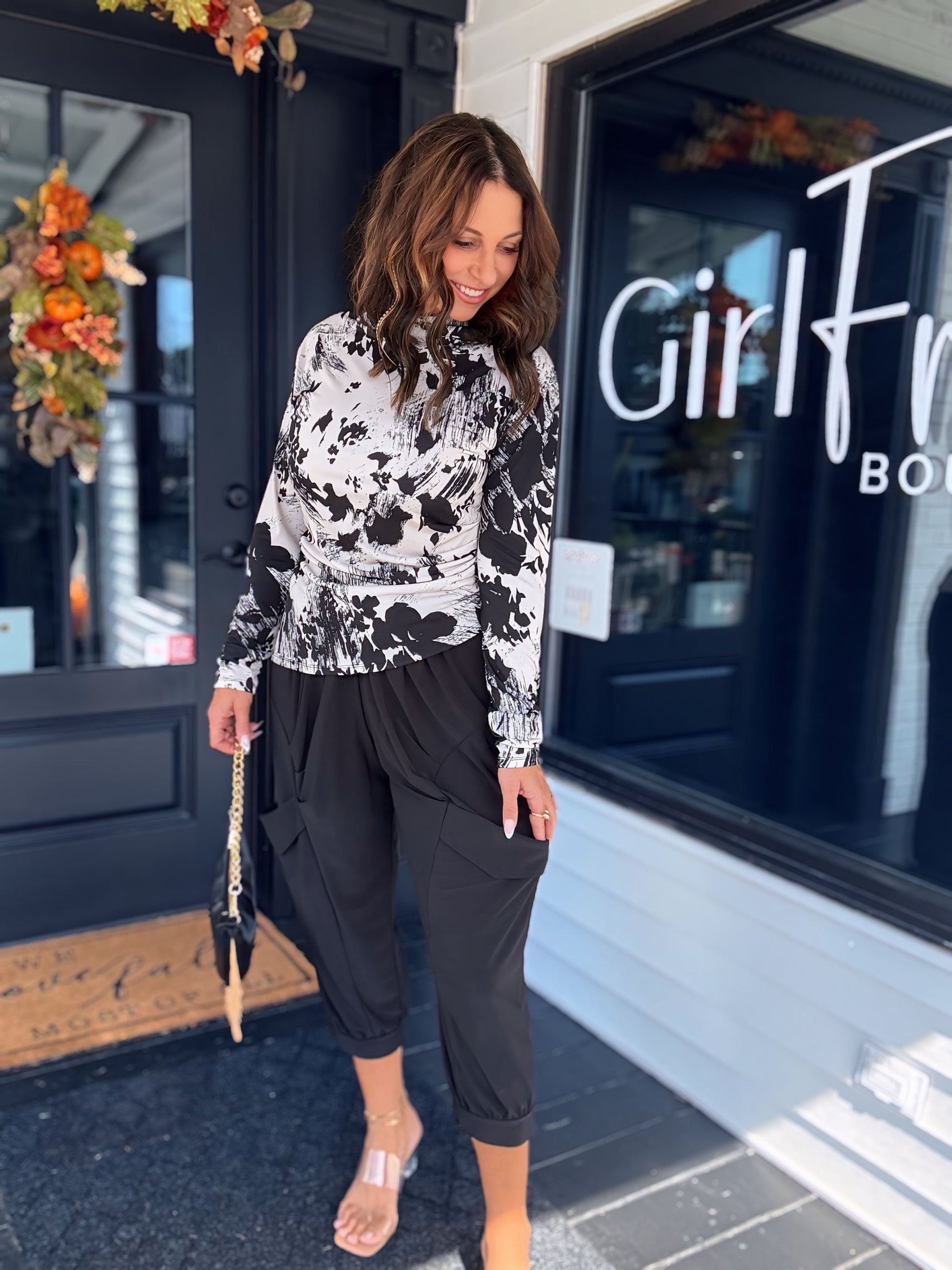 DETAILS: Elastic Waistband, Side Pockets, Drape, Style Lines, Cropped Fit FIT: Cropped, Pull On Pant.